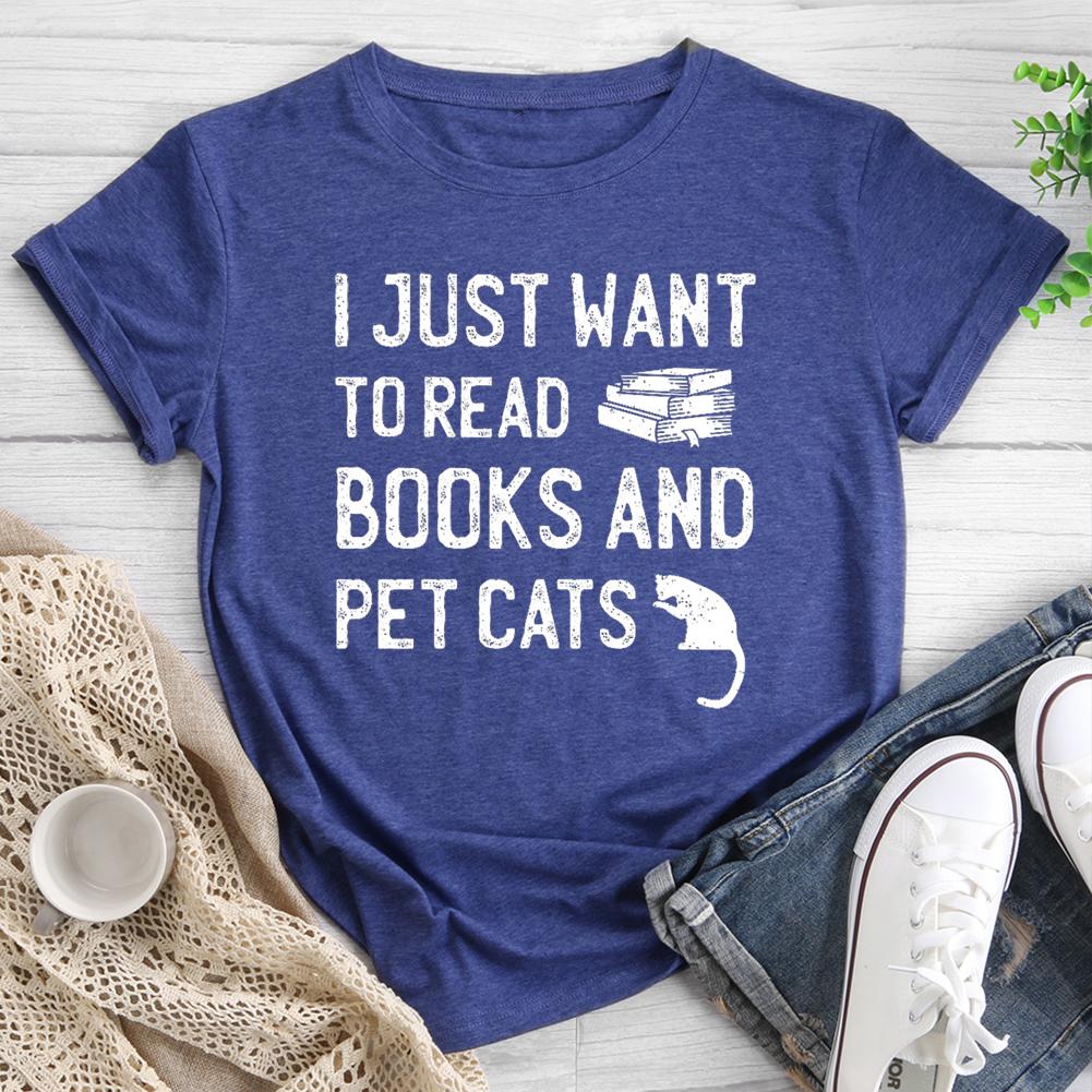 I Just Want to Read Books and Pet Cats Round Neck T-shirt